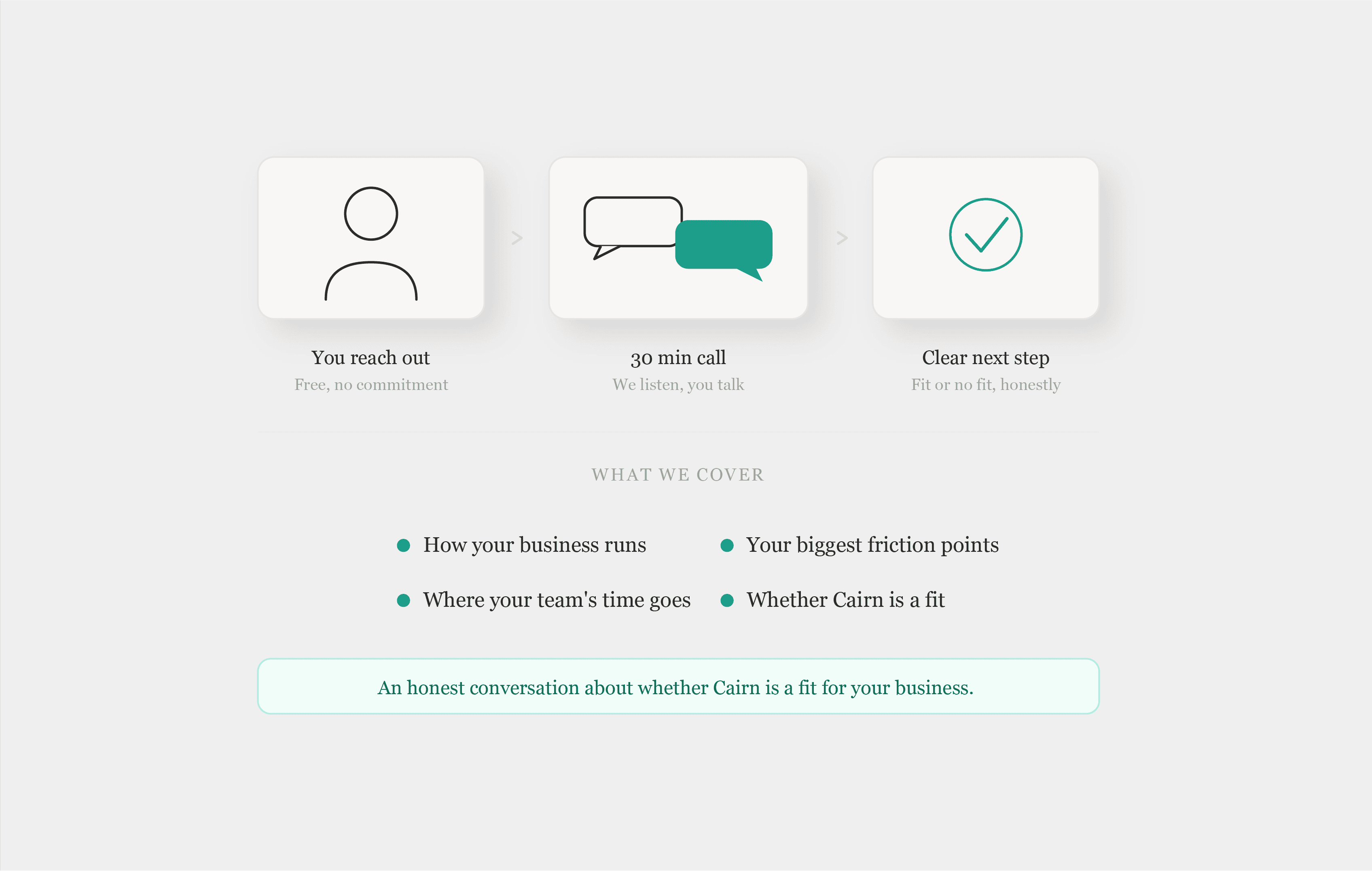 Businesses with 2-30 employees who are growing but don't have a dedicated ops or tech person. If your team is spending hours on repetitive work and you know there's a better way, Cairn is probably a fit.